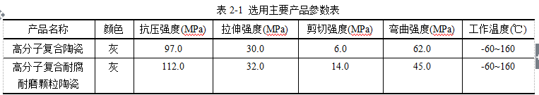 (2)高分子顆粒陶瓷是一種雙組份、填充陶瓷小顆粒、高性能表面涂層材料,主要成分是碳化硅、金屬碳化物和超硬陶瓷,具有良好的耐磨蝕和腐蝕性能,作為耐磨蝕和耐腐蝕保護涂層被廣泛的應用于各種化工設備及通用設備。適合應用于灰漿泵、水泵、風機、水輪機蝸殼、凈化煙道、氧化鋁粉輸送管道等內(nèi)壁防腐耐磨局部或大面積修復。